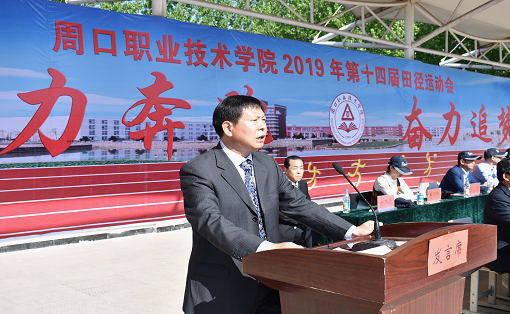 校长李清臣致开幕辞。他指出,长期以来,我校高度重视体育工作,始终坚持‘学校教育,健康第一’,积极开展‘阳光体育运动’,组织丰富多彩的体育赛事,增强广大师生的身体素质。他表示,周口职业技术学院多措并举加强文体基础设施建设,开元、文昌校区标准化体育场、开元校区体育馆先后建成投入使用。通过广大师生的不懈努力,校园体育设施日臻完善,体育氛围日益浓厚,师生多次在省、市运动会等各类比赛中取得骄人成绩。一年一度的田径运动会,不仅是对全校体育教学工作、师生精神面貌的一次大检阅,也是广大师生个性特长及运动风采的一次大比武,更是各参赛队伍竞争意识、团队协作、顽强拼搏精神的综合体现,必将进一步推动全校体育工作乃至各项事业的快速发展。