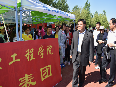 比赛间隙,李清臣校长带领校领导班子成员现场巡查了裁判员和工作人员及各院系竞赛队伍,并对特邀前来的医疗保障合作单位周口协和骨科医院的医护人员表示了感谢。