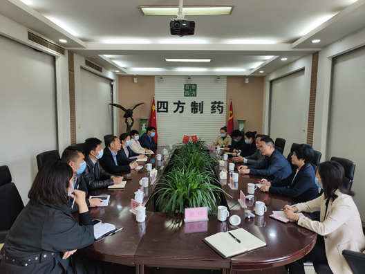四方药业集团董事长赵新年热情接待王隼一行,带领大家观看企业宣传片,实地参观企业系列产品。四方药业集团生产总监蔡晓领、王磊,质量总监宋爱叶,项目总监权名阳,人力资源总监朱冬平等陪同参观。
