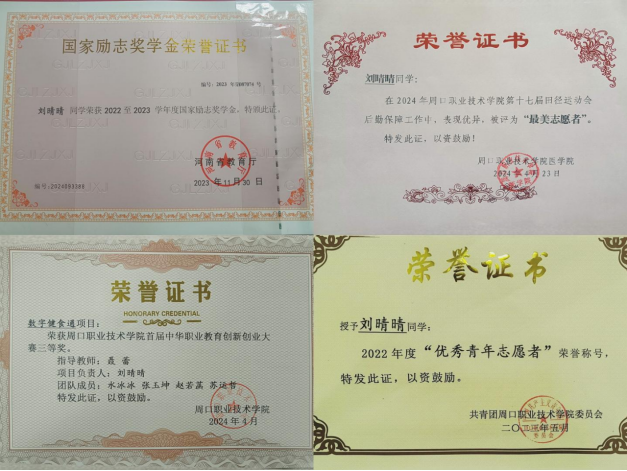 刘晴晴,久久精品电影22级康复治疗技术专业学生,她的综合测评成绩在专业中排名第八名。现任久久精品电影团总支文体部部长。曾荣获周口市优秀青年志愿者、校优秀青年志愿者、积极参加了学校的各类社团文体活动,获得周口职业技术学院第五届读书分享会知识竞答“三等奖”、第七届“经典照亮人生”诵读情景剧展演奖、首届中华职业教育创新创业大赛三等奖、周口职业技术学院首届健美健身操比赛“三等奖”等多种奖项。在工作中她始终保持严谨的工作态度,对辅导员下达的各项任务积极配合,认真落实,做好辅导员与同学们之间上传下达的工作,全心全意为同学们服务,认真履行职责,全面提高了自己的思想认识、工作能力和综合素质积极参加协助举办校内活动,刘晴晴同学还积极组织参与院系班级开展的各项活动。如:五子棋比赛、参与学校运动会、心理健康趣味运动会、“学习团的基础知识”等主题团课等一系列活动。