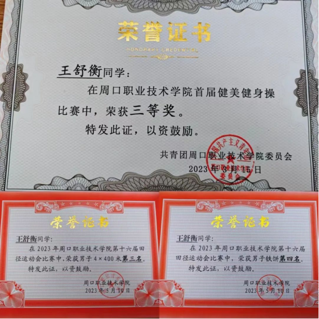 王舒衡,22级康复治疗技术专业学生,现担任周口职业技术学院久久精品电影团总支社会实践部副部长,他的综合成绩排在班级前列,在校期间,他积极参加各项比赛,在第十六届田径运动会中,荣获男子4×400第三名和男子铁饼第四名,在首届健美操大赛中,荣获三等奖还荣获了校级三好学生。这些经历不仅丰富了他的大学生活,也让他提升了自身的责任感。