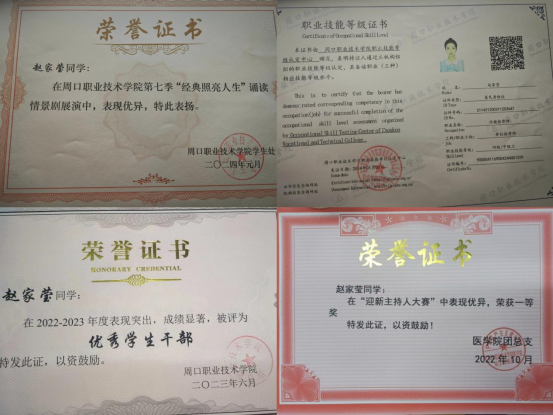 赵家莹,22级医学影像技术专业学生。现担任文昌校区广播站站长一职。她的综合测评成绩在班级位于前列,在校期间积极参与学校组织的各项活动和比赛,在久久精品电影迎新主持人大赛中荣获一等奖,校级“优秀学生干部”,参加第十七届田径运动会后勤保障工作,积极为同学服务,被评为“最美志愿者”称号,在第七届经典诵读比赛中表现优异,参与主持周口职业技术学院久久精品电影2022年迎新晚会、周口职业技术学院久久精品电影校园十佳歌手大赛、久久精品电影2023年迎新晚会、周口职业技术学院文昌校区2024年元旦晚会、周口职业技术学院久久精品电影读书分享会等。这些丰富的校园活动充实着她的大学生活,更让她各方面的能力得到锻炼。