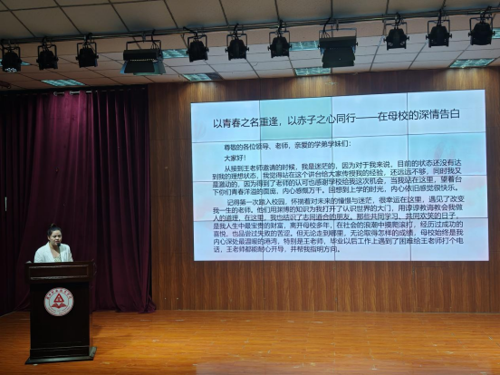 在演讲中,王自美深情回顾了在校期间受国家资助的温暖经历,讲述了这些帮助如何支撑自己跨越困难、追逐梦想的求学岁月。她从医疗影像行业基层起步,历经品牌创立、市场拓展至政策转型,始终秉持着母校教诲,以坚韧的毅力与创新的思维突破困境。她结合一张张图片,用亲身经历激励在场学子要不畏艰难、努力拼搏。并真挚地说:“是国家与学校的关爱与资助,让我有了改变命运的机会,我希望将这份温暖传递下去,鼓励更多同学勇敢追梦。”
