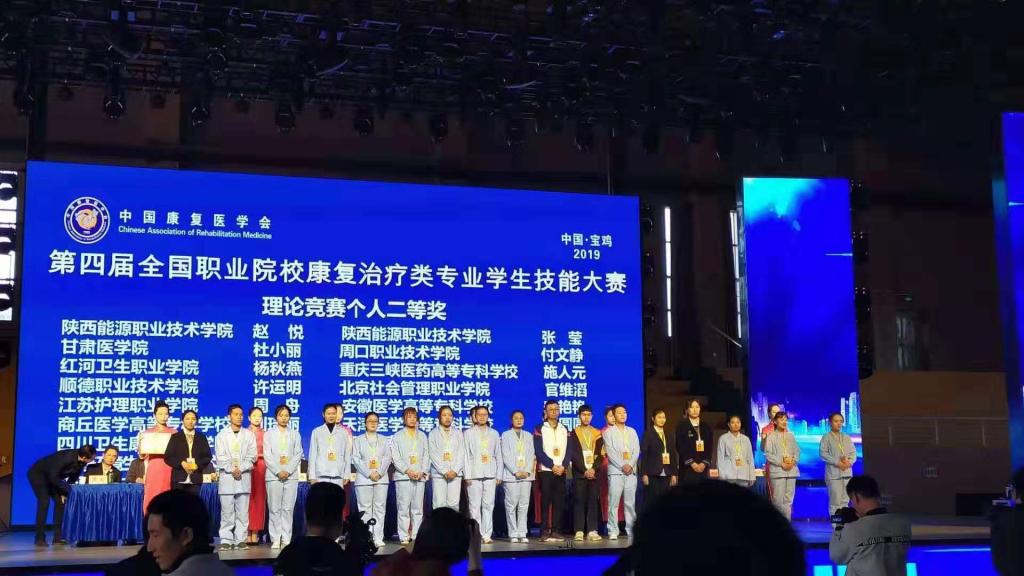 本次大赛由中国康复医学会康复医学教育专业委员会、全国卫生职业教育教学指导委员会康复治疗类专委会主办,宝鸡职业技术学院承办。大赛历时三天,赛项包括理论知识与操作技能竞赛,共有来自全国71个院校的271名选手参加比赛。经过激烈角逐,我院学生付文静获理论竞赛个人二等奖和康复评定个人三等奖,支润泽获康复治疗个人二等奖,马慧娟获精神风貌奖。曹天晴、候峰、方亚雯、邓舒允四位老师荣获优秀指导教师奖。