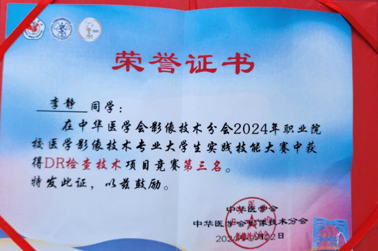 比赛过程中,我校参赛队员充分展示了娴熟的实践技能、良好的职业素养。经过激烈角逐,我校学生李静同学获DR组第三名的优异成绩。