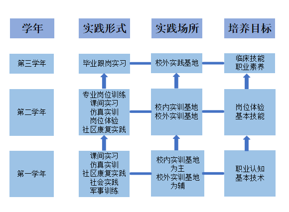 在专业课程体系的基础上,推行贯穿3年教学计划的全过程接触临床的“见习-实训-实习”一贯式实践教学体系,并在实践教学中开展项目化床边教学。