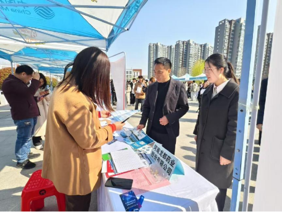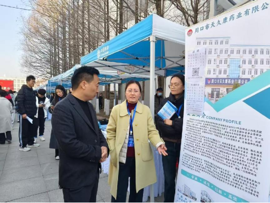 上海灿耀天昂智能科技有限公司、河南龙都药业股份有限公司、福瑞堂制药有限公司、周口市天久康药业有限公司等单位来校揽才。苑书记深入双选会现场调研,与用人单位沟通交流,与毕业生进行亲切交谈,了解用人单位的招聘需求,询问毕业生的求职意向。
