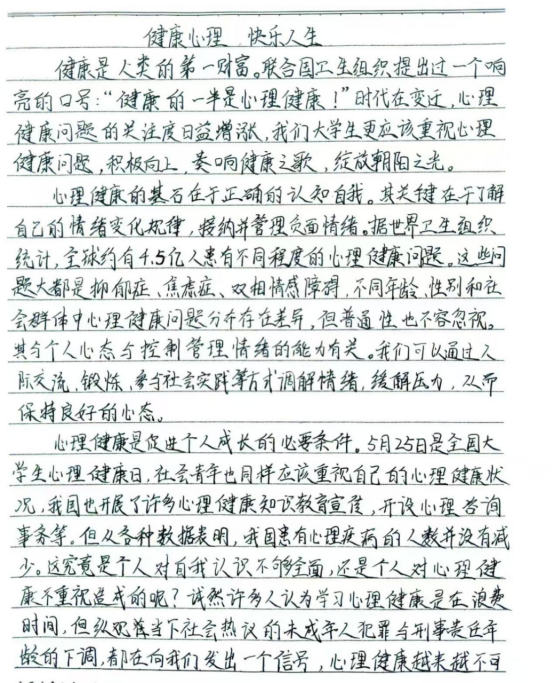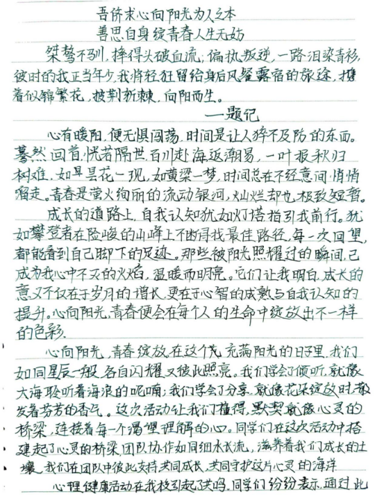 同学们以真挚的情感、细腻的笔触,剖析自身内心深处的情感纠葛与自我挣扎,分享了在心理健康教育课程与活动中的收获与启发。这些文章从不同角度展现了大学生们丰富的内心世界和对心理健康的深刻理解,如同一面面镜子,映射出同学们在成长道路上的喜怒哀乐。